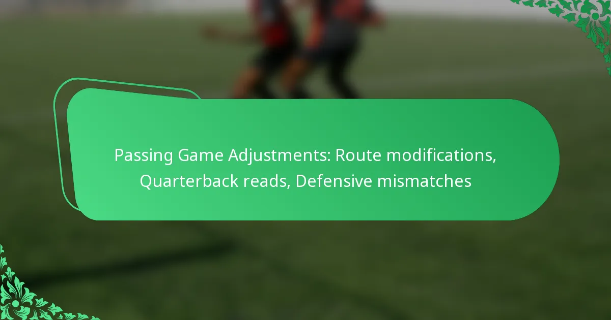 Passing game adjustments are essential for optimizing offensive strategies in football, focusing on route modifications, quarterback reads, and exploiting defensive mismatches. By adapting routes to counter defensive alignments, receivers can enhance their effectiveness, while quarterbacks must quickly assess the field to make informed decisions. These adjustments work in tandem to maximize the potential for successful completions and capitalize on defensive vulnerabilities.